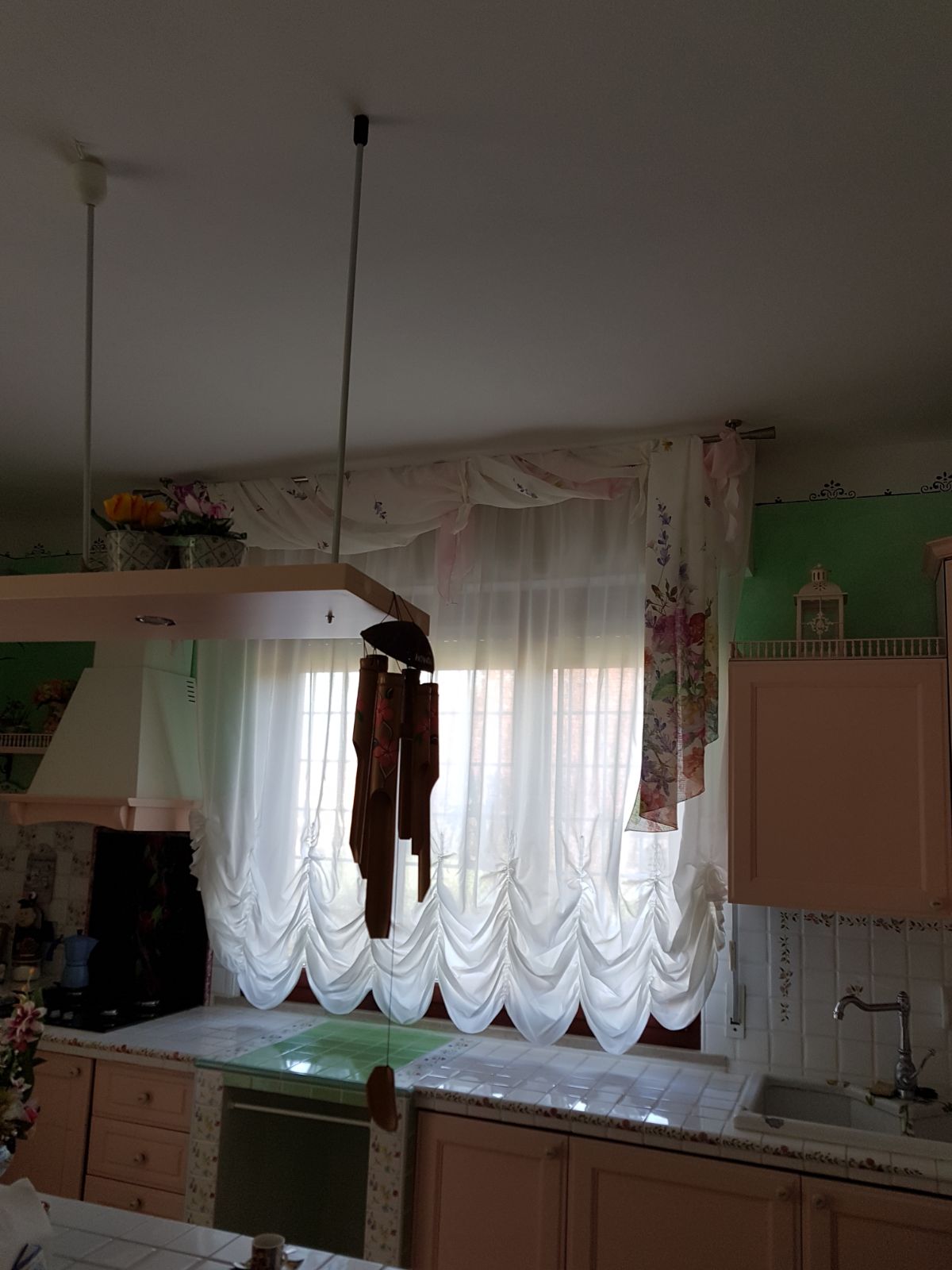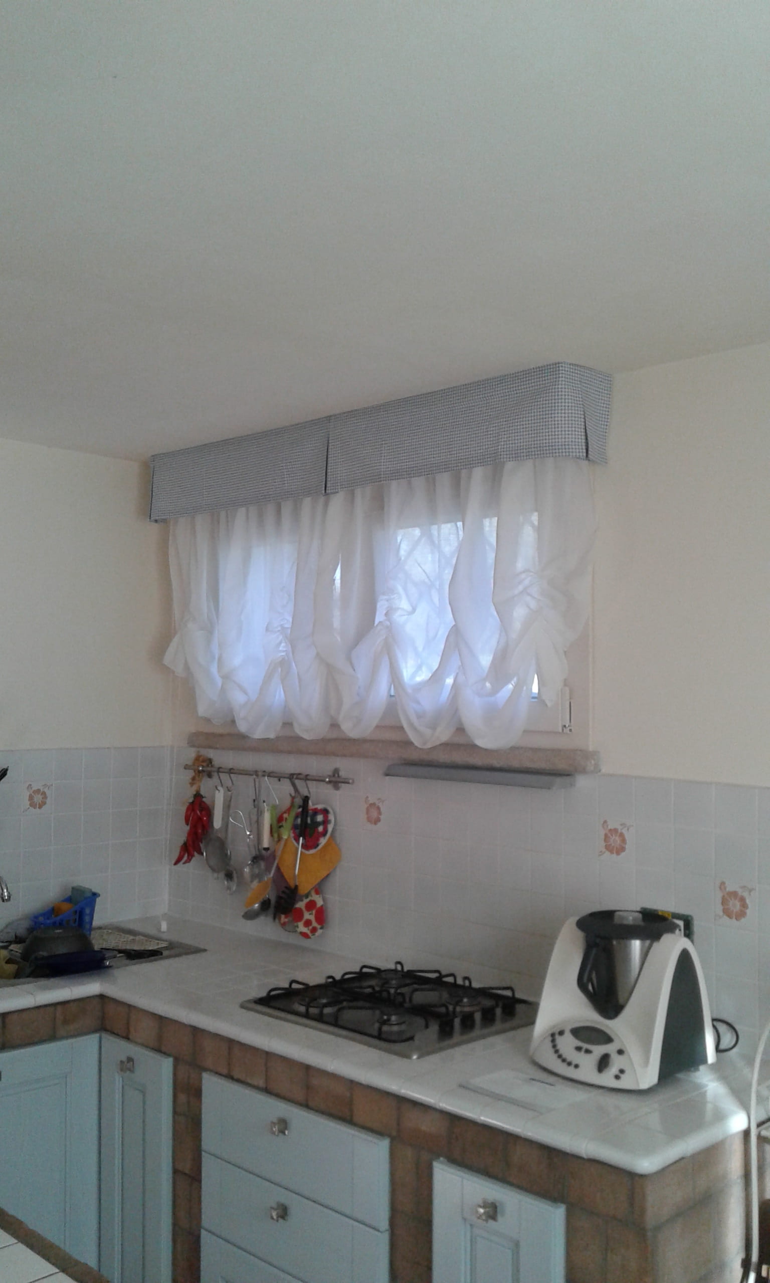 Nella foto seguente, riportiamo un esempio di mantovana con drappeggio teso che completa un tendaggio. Questo tipo di mantovana è oggi molto richiesta per ogni tipo di tenda, sia classica che moderna.