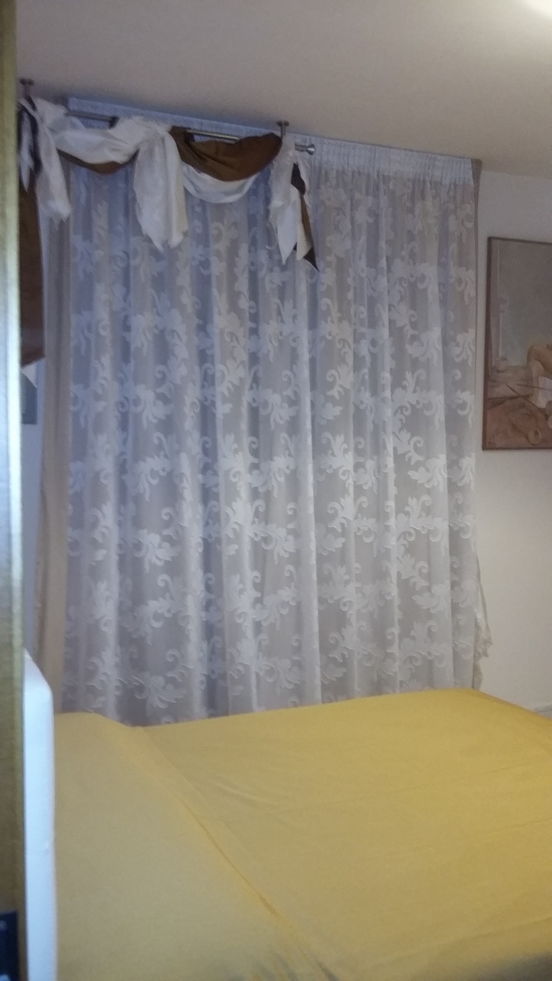 La mantovana in stile impero può essere creata con un drappo di tessuto che poggia su un bastone o, come nella foto seguente, facendo scorrere il tessuto sul binario. Questo drappo è più appariscente del precedente: ha più pance, è bicolore e ha calate laterali di lunghezza e colore diversi. Per questo rende “scenografica” una “semplice” tenda bianca.